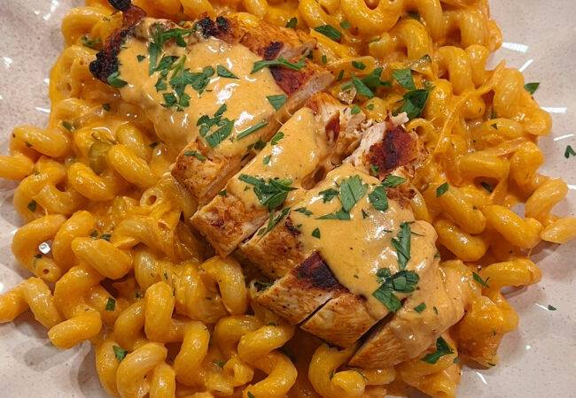 Creamy Buffalo Chicken Alfredo Pasta with Caramelized Onions