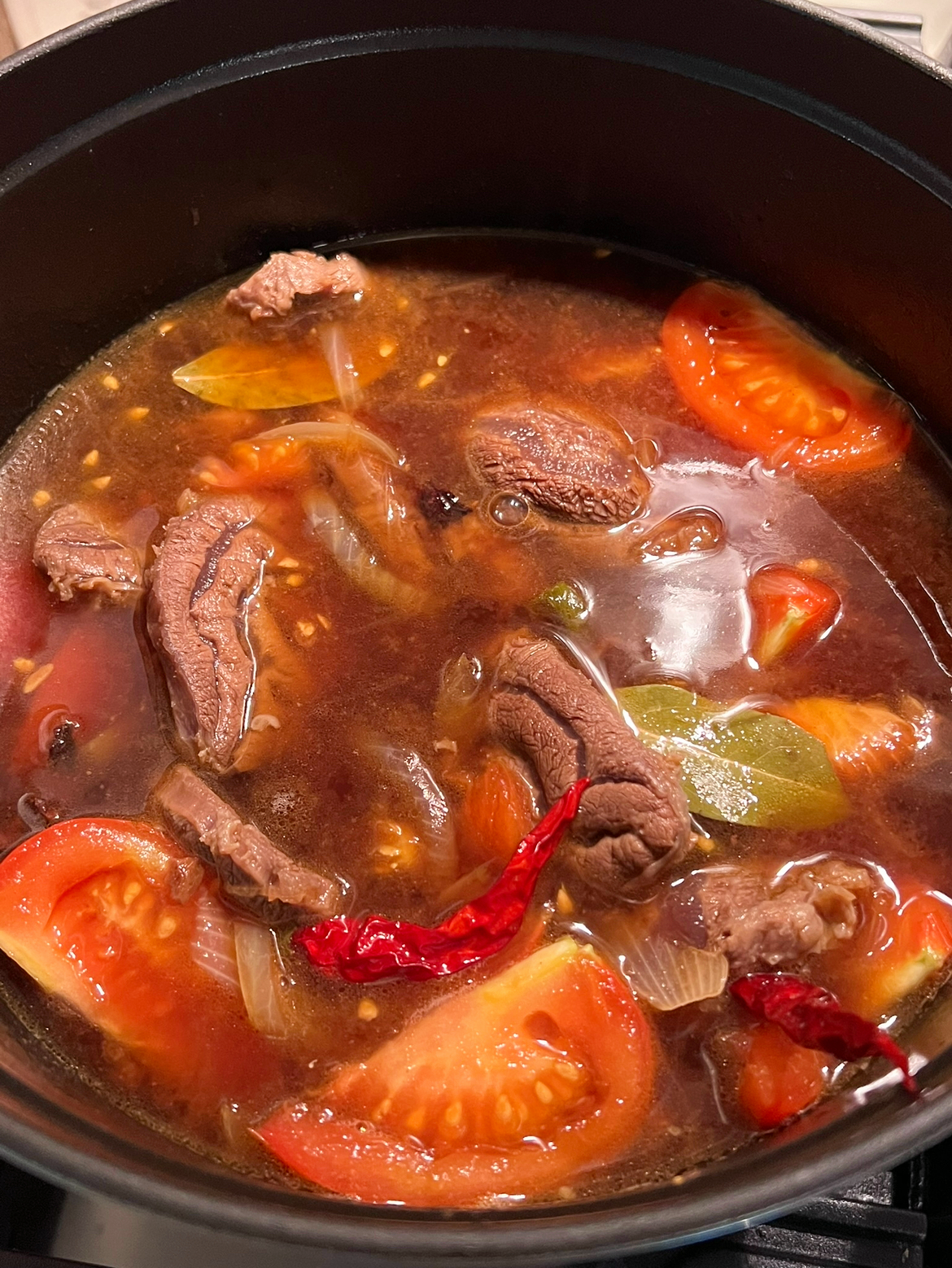 Cover and simmer on low heat for at least 2 hours, until the beef becomes fork-tender and the broth develops a rich, deep color.