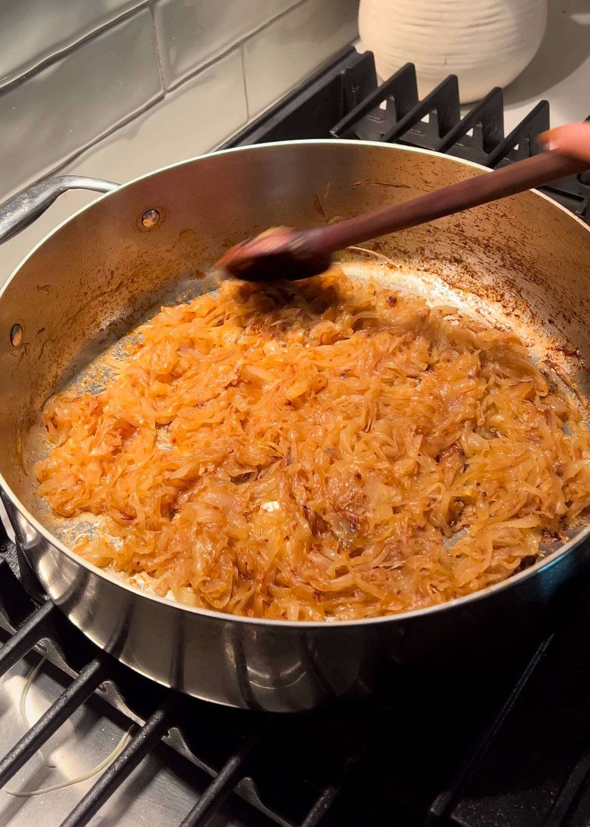 2 tbsp butter & 2 tbsp olive oil – The perfect combo for caramelizing onions without burning them.