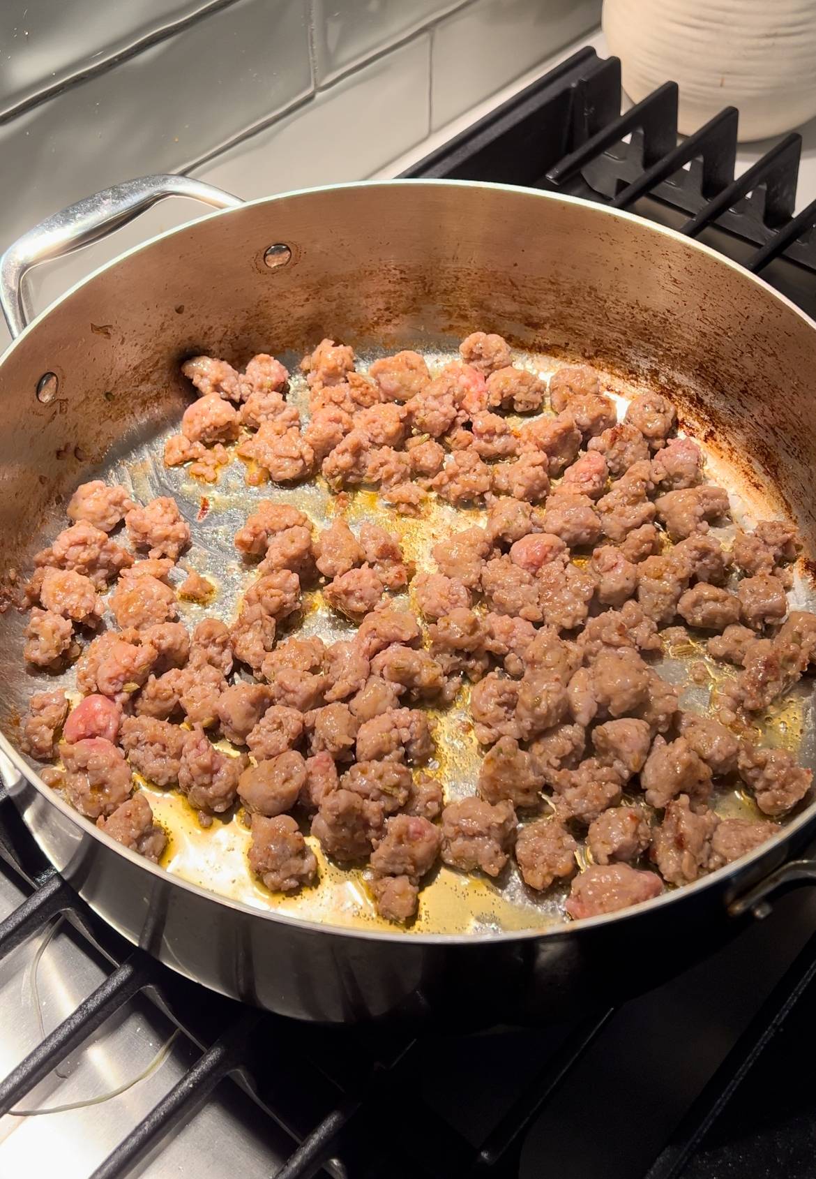 - Add the sausage to the same pan and cook over medium heat. Break it into small pieces with a spatula and cook until browned and cooked through. Add the minced garlic, chopped sun-dried tomatoes, Calabrian chili, and Italian seasoning. Cook for about 1 minute, until fragrant.