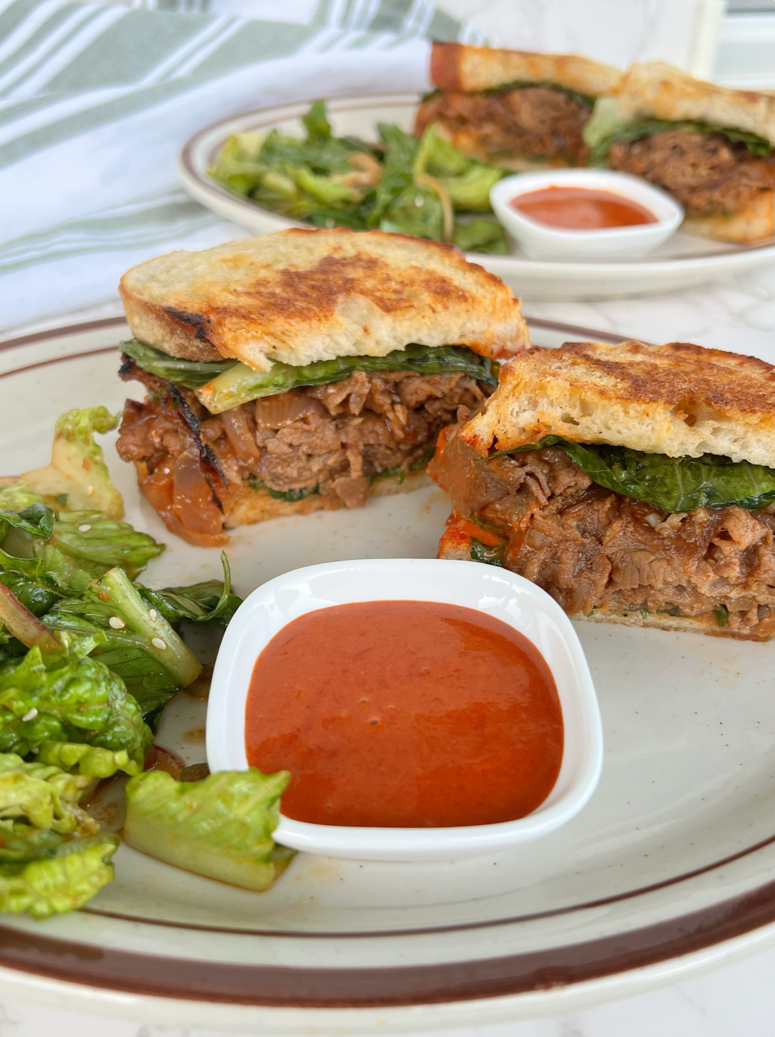 This sandwich is everything you want in a quick but unforgettable meal—it’s juicy, savory, melty, fresh, and full of Korean-inspired heat. Each bite has layers of flavor: caramelized onion, tender steak, umami-rich gochujang sauce, and cool, crunchy toppings like cucumber and romaine to balance it all out. The toasted sourdough gives it a golden crispness that pulls everything together.