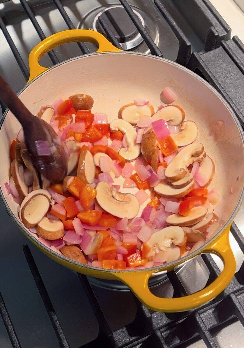 Sauté the veggies—onion, bell pepper, and mushrooms—until softened. Set them aside.