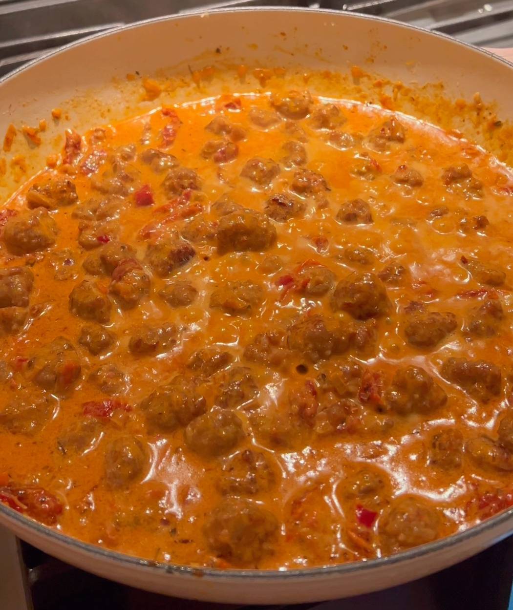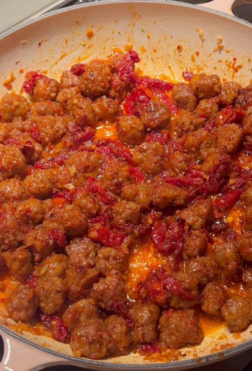 - In the same skillet, add the diced shallots and minced garlic. Cook for 1-2 minutes until fragrant. Add the tomato paste, sun-dried tomatoes, sun-dried tomato oil, Calabrian chili, smoke paprika, garlic powder, and Italian seasoning. Cook for 30-60 seconds, stirring constantly, until fragrant and well combined. Return the cooked sausage to the pan and stir to combine.