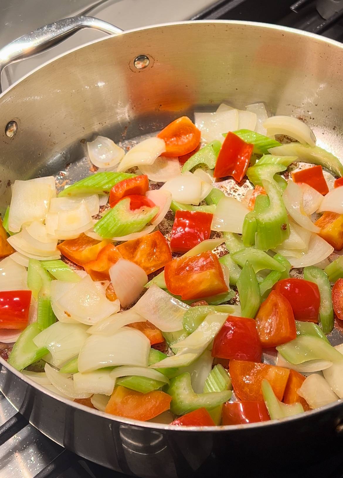 - Add the remaining 2 tbsp oil to the pan over medium heat. Add the onion, celery, and bell pepper. Stir-fry for 2 minutes, then remove and set aside.